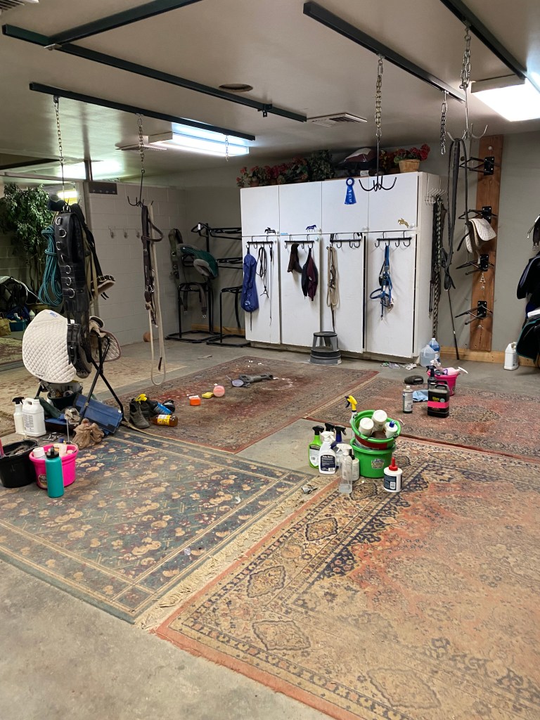 Quickly it became apparent this was a dangerous situation. Within the hour, the barn owner began coordinating plans to evacuate all 40 horses. As we waited for trailers to arrive, those of us not on the phones, began hauling saddles, bridles, and tack trunks out of the barn, and into our cars.