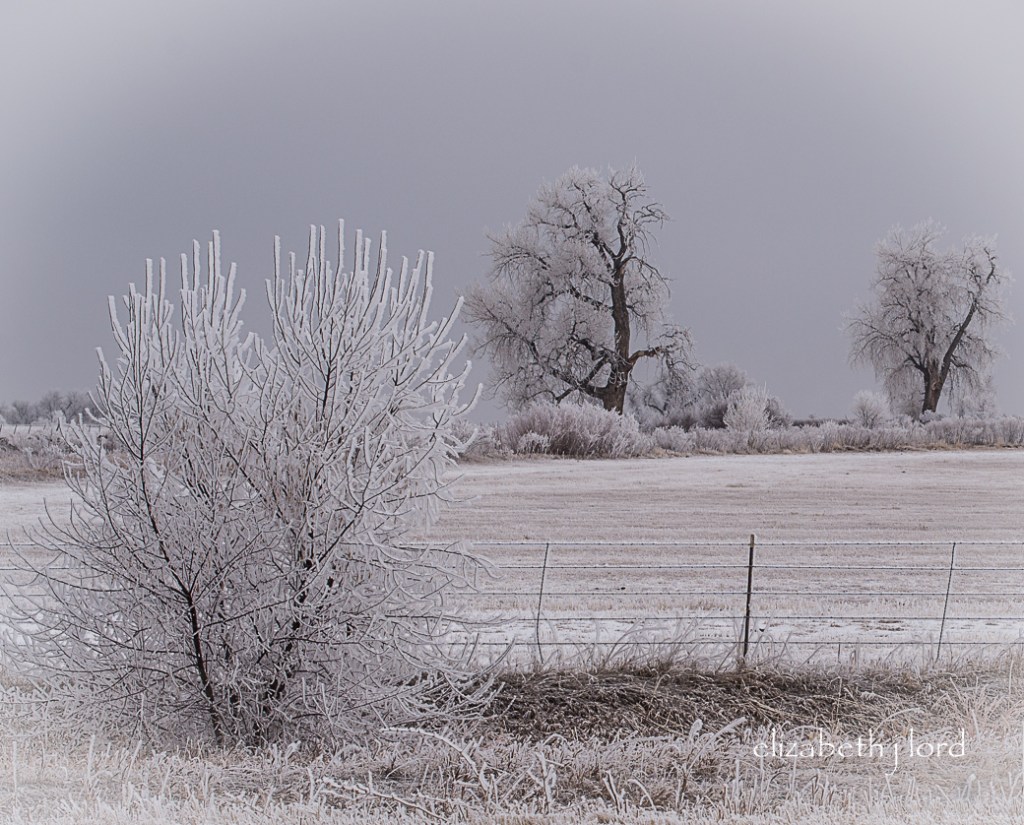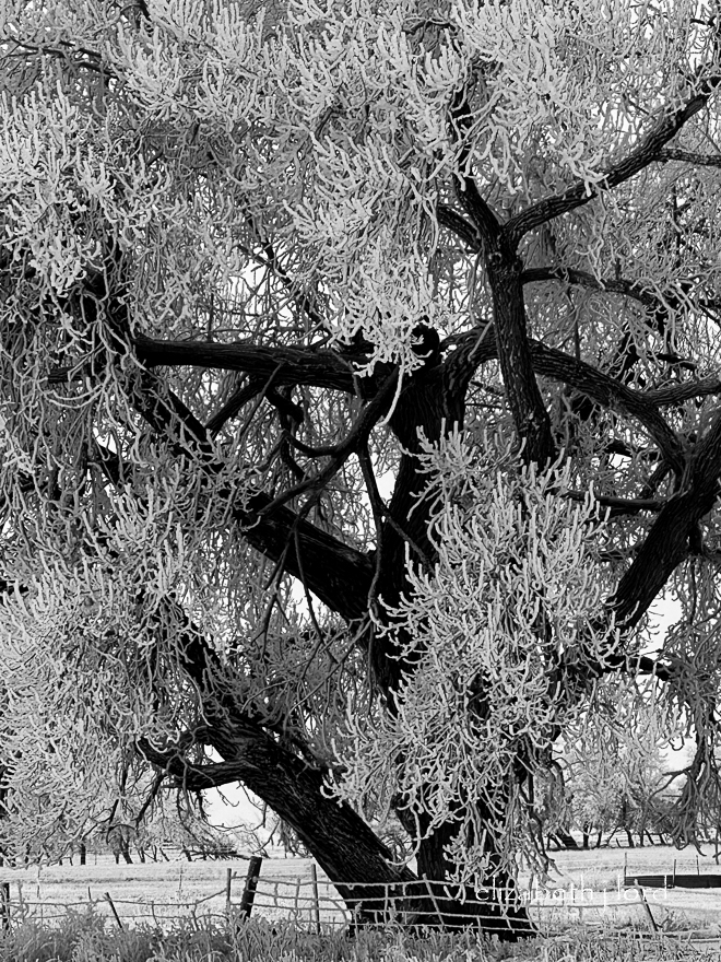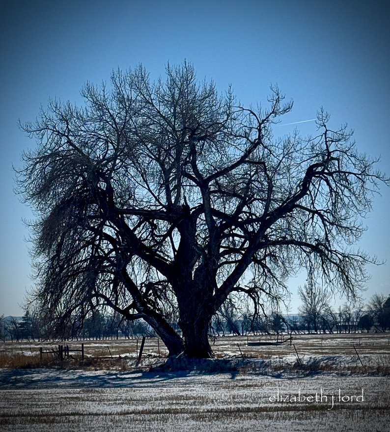 I have a favorite cottonwood tree that posed as a standing fashion model as her outfits were changed. Once draped in fog, then wrapped in ice and finally flaunting a fresh coat of snow.