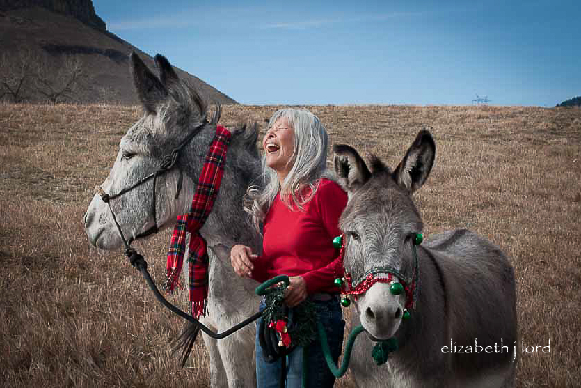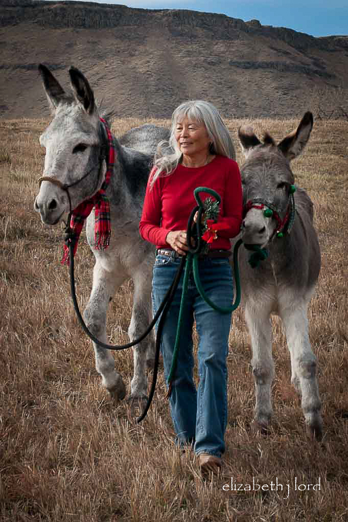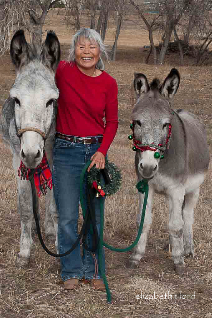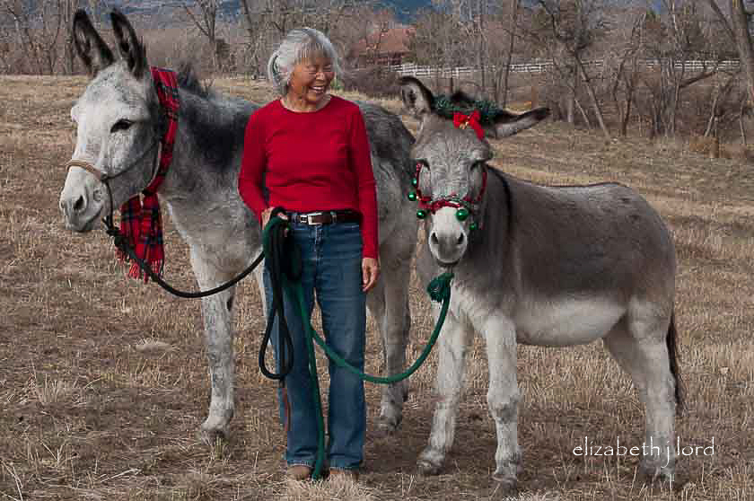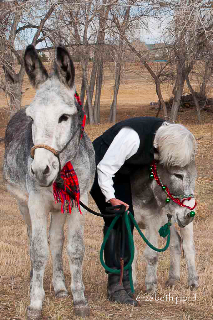 As the winter holidays approached, we wanted to decorate something. In Colorado we rarely have a lovely background of snow-covered trees, fences or pastures in December. However, we wanted holiday pictures with the donks, so, Carol and I decided to decorate them! It was probably a ‘first’ for the boys and we had no idea what their reactions to bells, balls and tinsel might be.