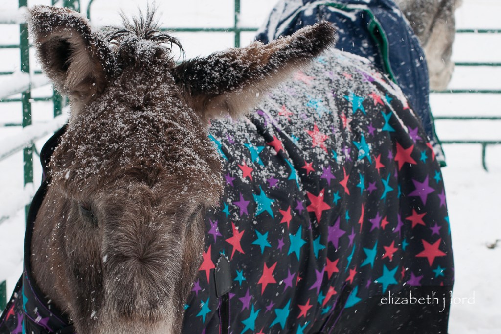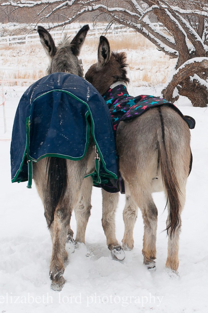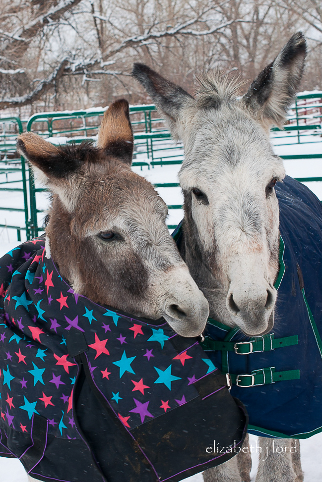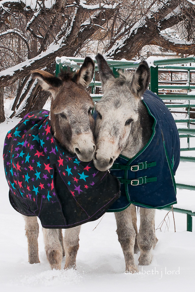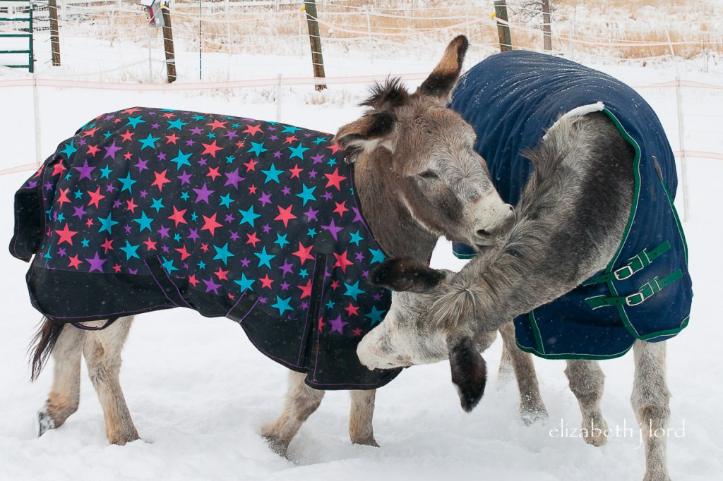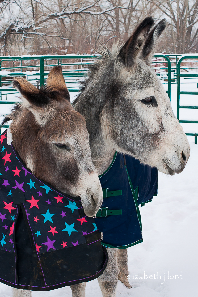 Susie and Carol are excellent horsekeepers. When winter comes, they pull out the blankets to protect their horses from the chill and wet snow. Styx and Louie arrived in the summer so as temperatures began to drop, they went shopping for coats for the boys. Stars for the tough guy and a solid for the gentleman.