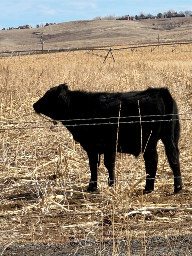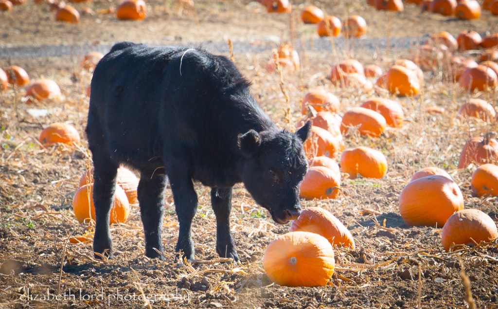 This farm offered ‘You pick ‘um Pumpkins.’ After Halloween the cows were turned out in the field to feast on the rejects. I captured this calf, contemplating how to eat a pumpkin like his mom was doing. Brave little guy!