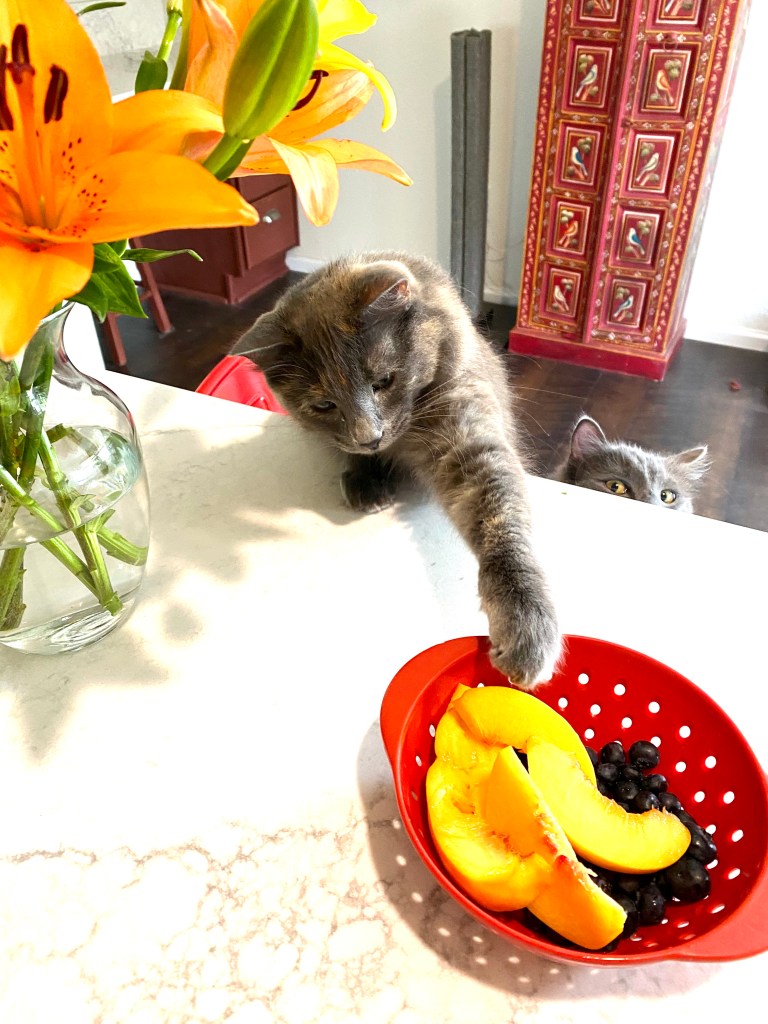 Maisie can’t help but notice the aroma of fresh Palisade peaches. She thinks I can’t see her trying to snag a piece with her fingernail while her brother, Billy looks askance at her bravery.