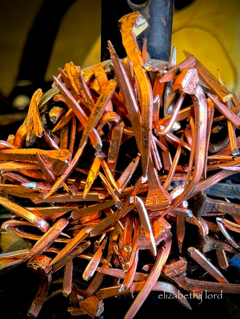 Often, I simply see something intriguing, like the morning light illuminating the copper coated farrier nails.