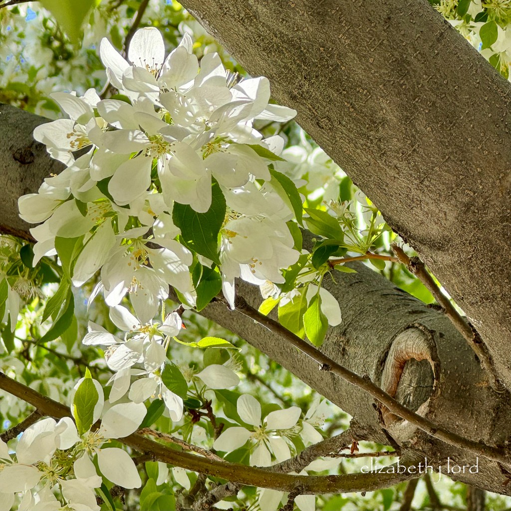 Each spring, as I have breakfast at my kitchen table, I am delighted to see these snowy crabapple blossoms. Following a view of stark grey branches, they provide a burst of lushness for my wintered eyes.