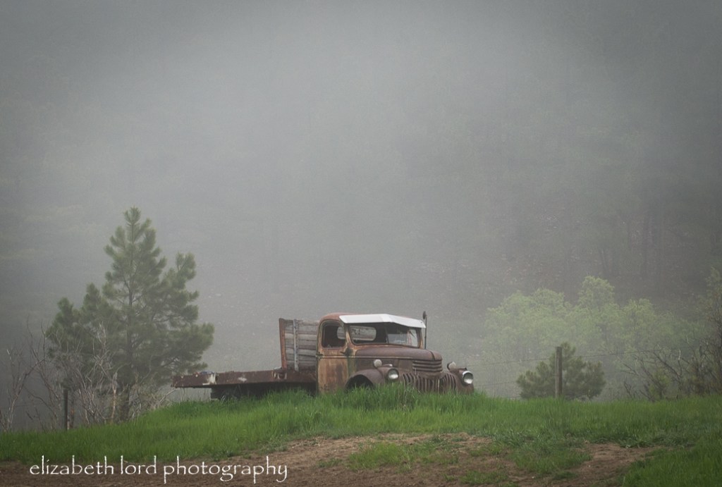 None of that really matters; it captures my eye and imagination. To me mist, evokes mystery, add the rust, the green, the color of the dirt, the light catching the headlamps and the bright sunscreen above the windshield. What else do you see?
